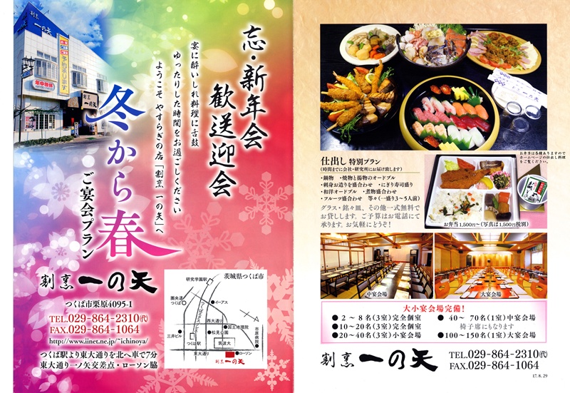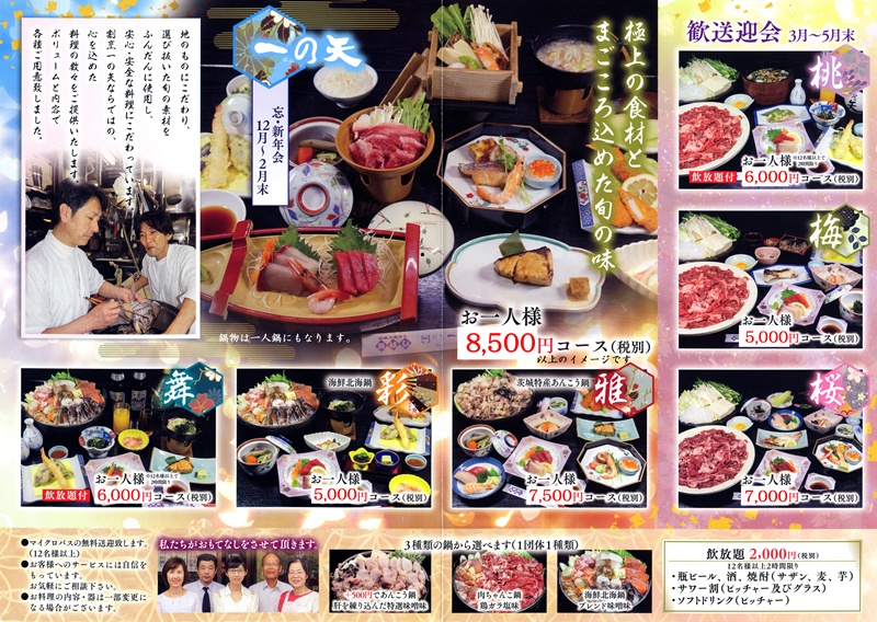 海の幸、山の幸をこの道30年の板前が、その旬の旨みを引き出したコース料理。 ”和の膳”コース料理 ご案内 四季折々の素材を大切に、筑波ならではの地物特産物を取り入れた年間を通したコース料理です。 |