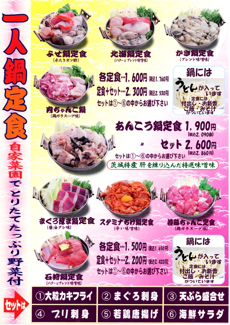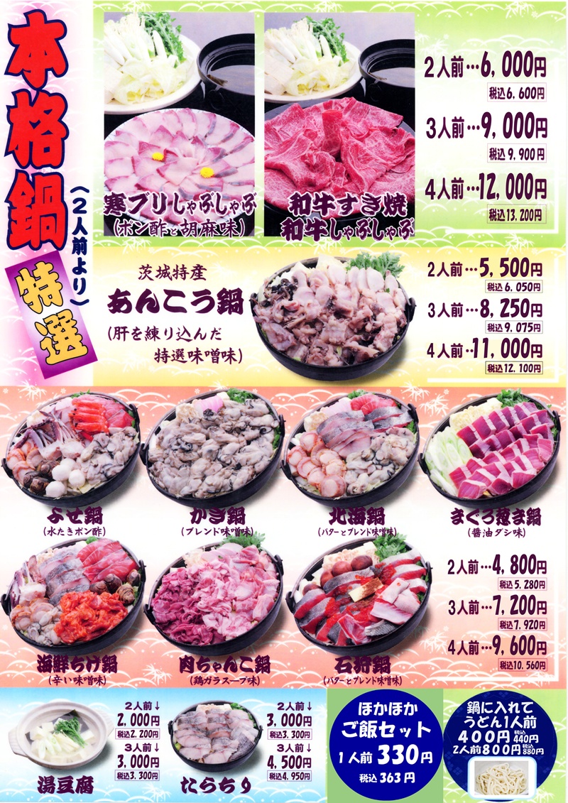 今年も本格鍋、一人鍋メニューが始まりました。 お好きな鍋をご賞味下さい。